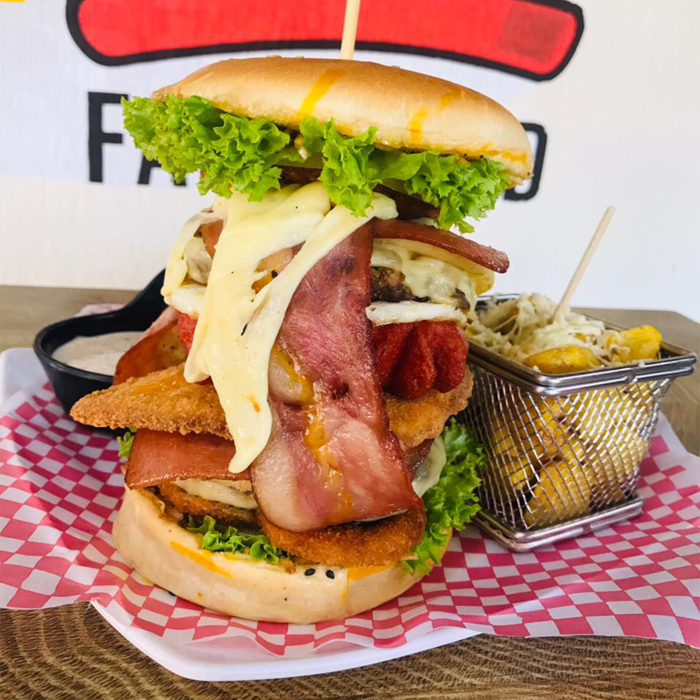 Doble carne de res 125G, jamón, chorizo, filete de pechuga, 125G de tocineta, queso mozarella, queso cheddar, cebolla aros crocantes, papita molida y salsas